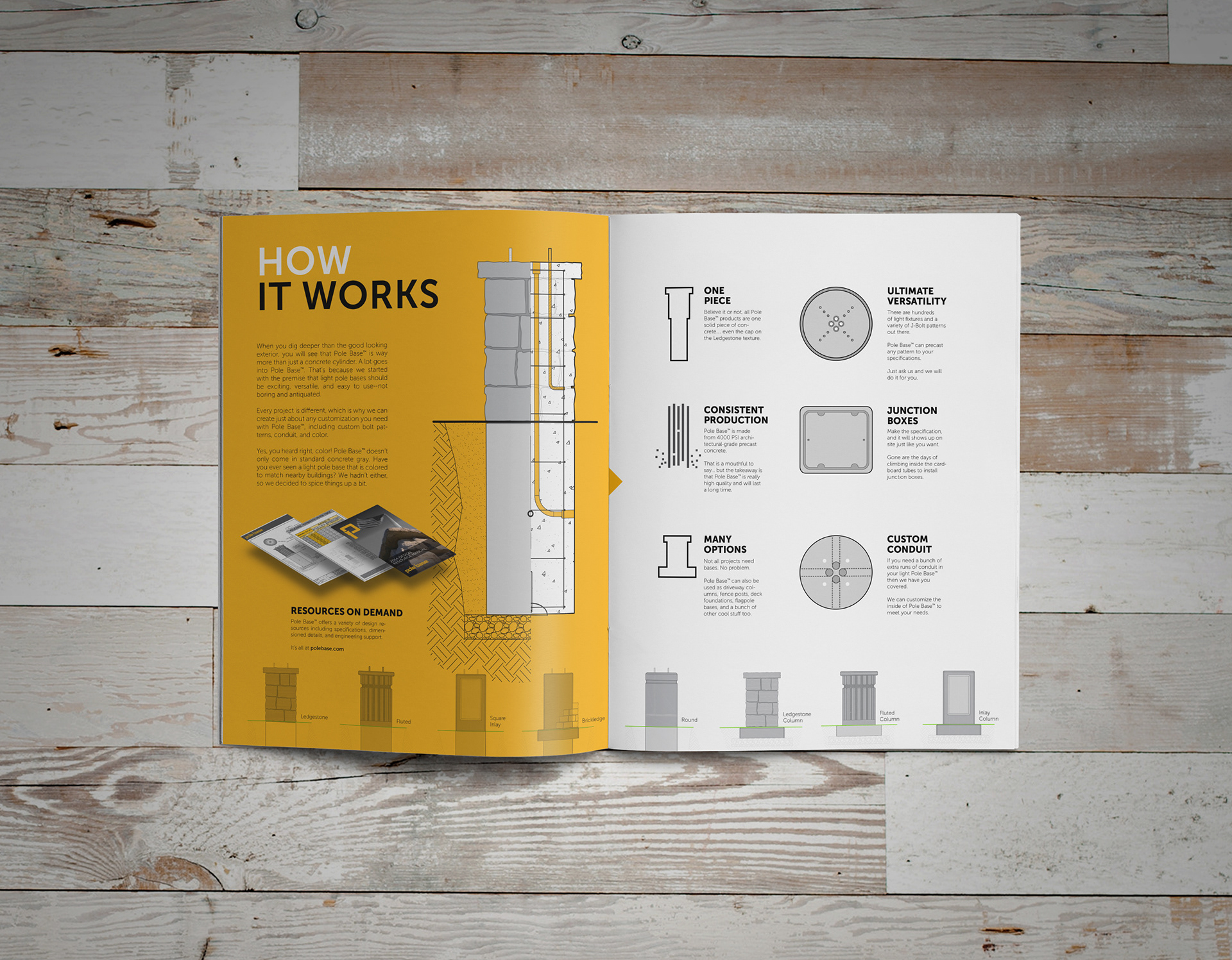 Creative direction for Pole Base, a subsidiary of Redi-Rock International. I was responsible for the development and implementation of the brand along with website wireframing and visualization, print marketing materials, technical guidebooks, CMS management, and promotional items associated with the brand.